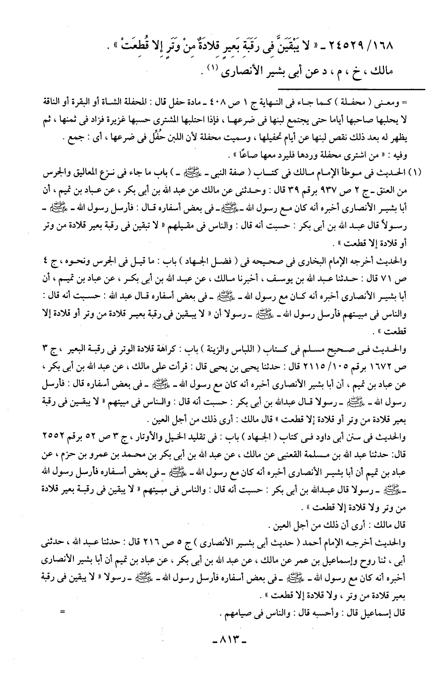 168/ 24529 - "لا يَبْقَيَنَّ فِي رَقَبَةِ بَعِيرٍ قِلادَةٌ مِنْ وَتَرٍ إِلا قُطِعَتْ".