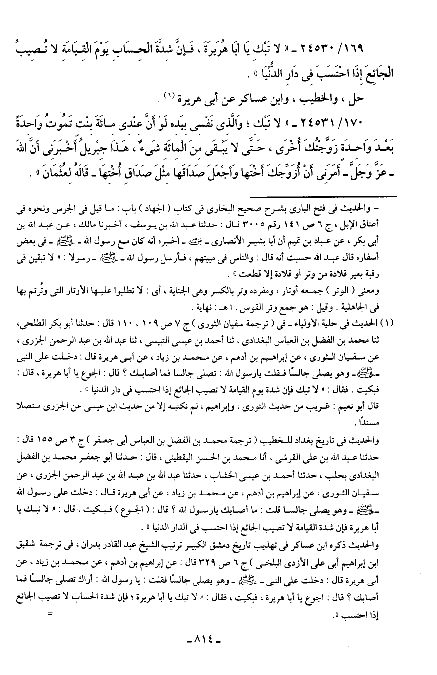 169/ 24530 - "لا تَبْكِ يَا أبَا هُرَيرَةَ، فَإنَّ شِدَّةَ الْحِسَابِ يَوْمَ الْقِيَامَةِ لا تُصِيبُ الْجَائِعَ إِذَا احْتَسَبَ فِي دَارِ الدُّنْيَا".