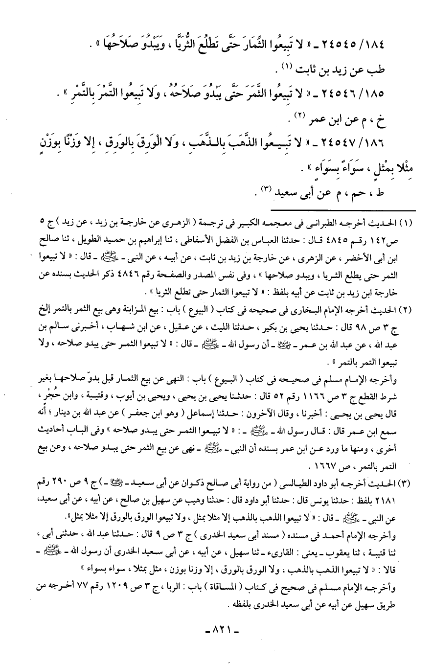 185/ 24546 - "لا تَبِيعُوا الثَّمَرَ حَتَّى يَبْدُوَ صَلَاحُهُ، وَلا تَبِيعُوا التَّمْرَ بِالتَّمْرِ".