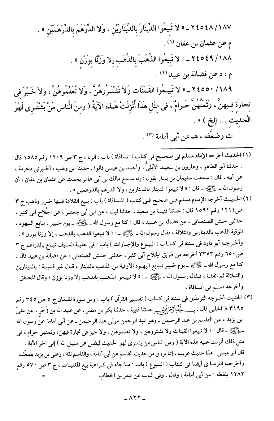187/ 24548 - "لا تَبِيعُوا الدِّينَارَ بِالدِّينَارَينِ، وَلا الدِّرْهَمَ بِالدِّرْهَمَينِ".