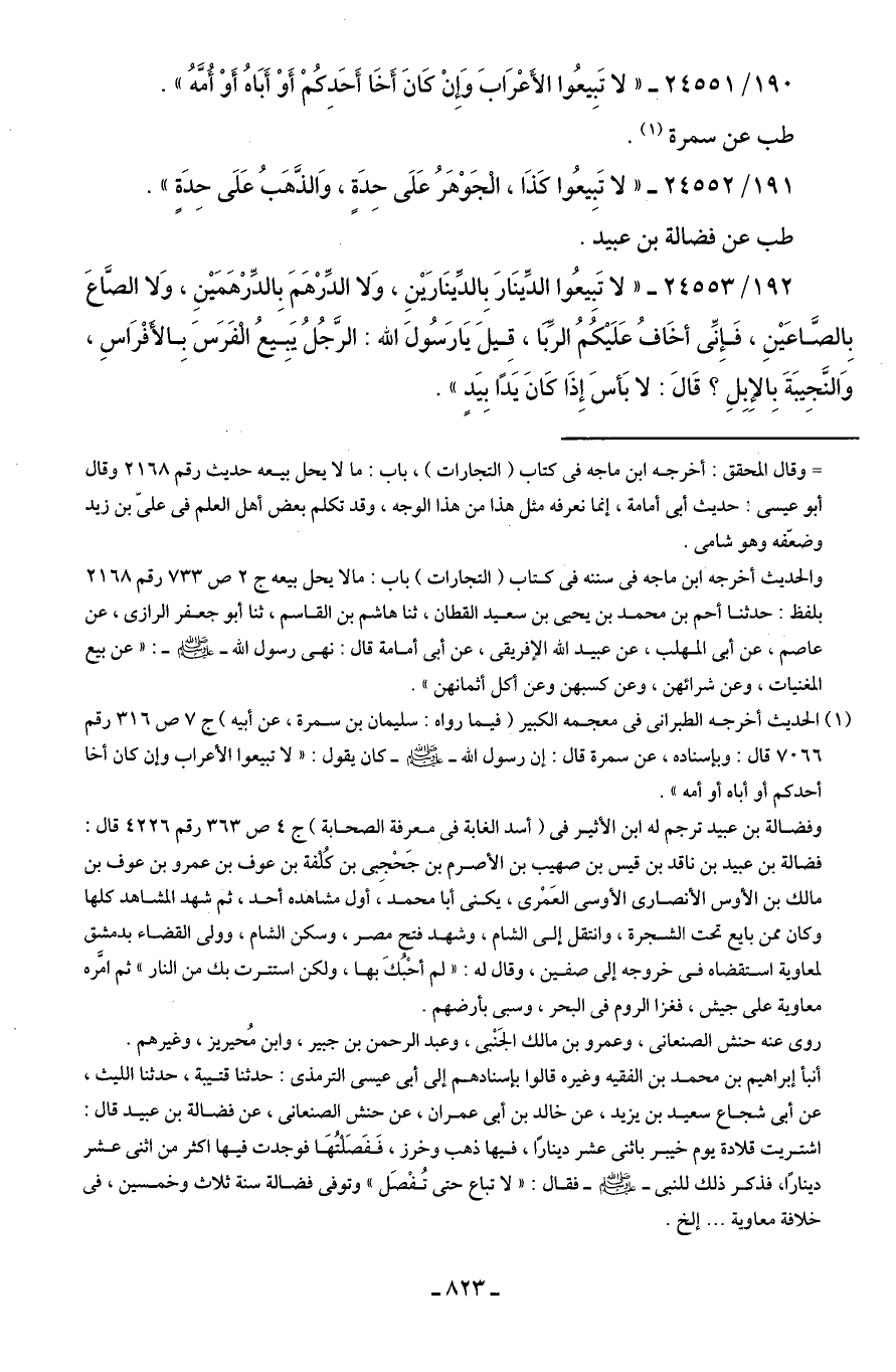 192/ 24553 - "لا تَبِيعُوا الدِّينَارَ بِالدِّينَارَينِ، وَلا الدِّرْهَمَ بِالدِّرْهَمَينِ، وَلا الصَّاعَ بِالصَّاعَينِ، فَإِنِّي أخَافُ عَلَيكُمُ الرِّبَا، قِيلَ يَا رَسُولَ الله: الرَّجُلُ يَبِيعُ الْفَرَسَ بِالأفْرَاسِ، وَالنَّجِيبَةَ بِالإِبِلِ؟ قَال: لا بَأسَ إِذَا كانَ يَدًا بِيَدٍ".