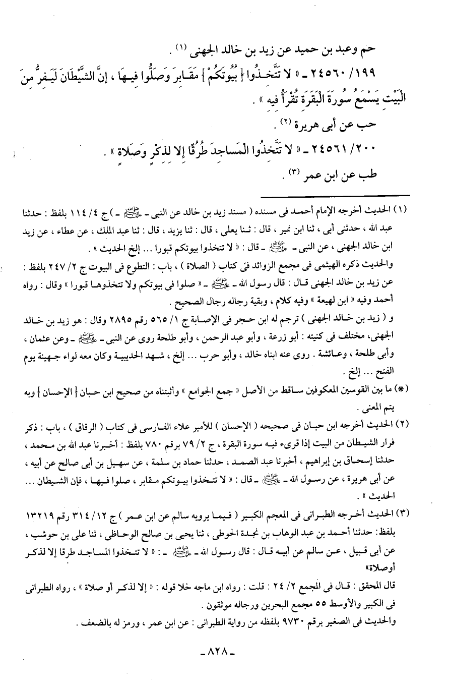 (¬1) الحديث أخرجه الإمام أحمد في مسنده (مسند زيد بن خالد عن النبي - صلى الله عليه وسلم -) ج 4/ 114 بلفظ: حدثنا عبد الله، حدثني أبي، ثنا ابن نمير، قال: ثنا يعلى، قال: ثنا يزيد، قال: ثنا عبد الملك، عن عطاء، عن زيد بن خالد الجهني، عن النبي - صلى الله عليه وسلم - قال: "لا تتخذوا بيوتكم قبورا ... إلخ الحديث".