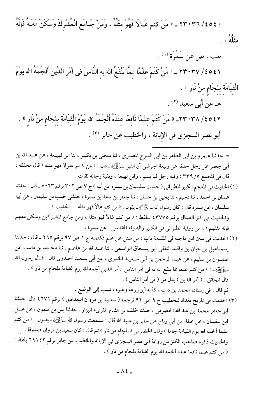 (¬2) الحديث في سنن ابن ماجه في المقدمة باب: من سئل عن علم فكتمه ج 1 ص 97 برقم 265 - قال: حدثنا إسماعيل بن حبان بن واقد الثقفي أبو إسحاق الواسطي، ثنا عبد الله بن عاصم، ثنا محمد بن داب، عن صفوان بن سليم، عن عبد الرحمن بن أبي سعيد الخدري، عن أبي سعيد الخدري قال: قال رسول الله - صلى الله عليه وسلم -: "من كتم علما مما ينفع الله به في أمر الناس، أمر الدين ألجمه الله يوم القيامة بلجام من نار".