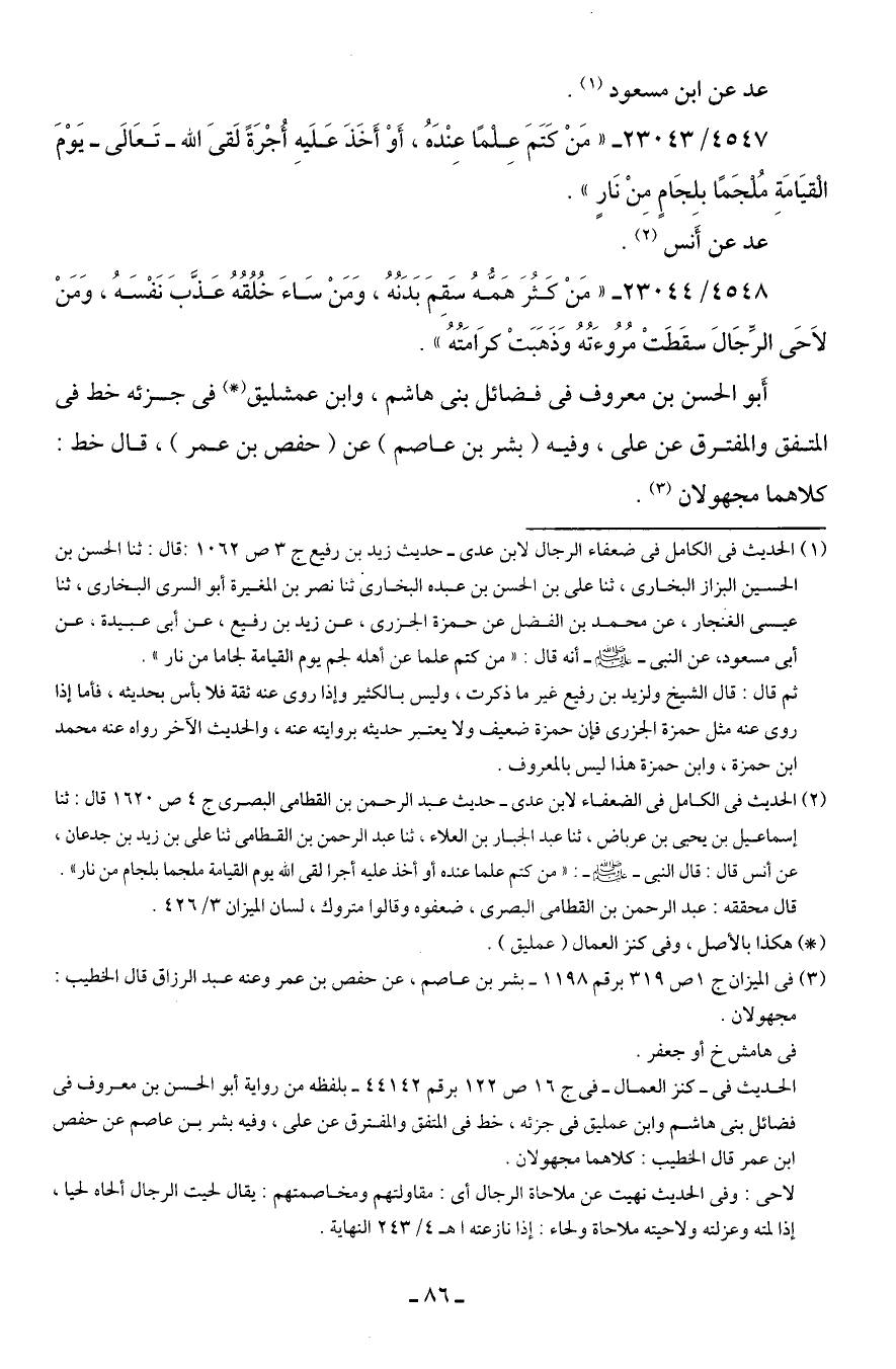 (¬2) الحديث في الكامل في الضعفاء لابن عدي- حديث عبد الرحمن بن القطامى البصري ج 4 ص 1620 قال: ثنا إسماعيل بن يحيى بن عرباض، ثنا عبد الجبار بن العلاء، ثنا عبد الرحمن بن القطامى ثنا علي بن زيد بن جدعان، عن أنس قال: قال النبي - صلى الله عليه وسلم -: "من كتم علما عنده أو أخذ عليه أجرا لقى الله يوم القيامة ملجما بلجام من نار".