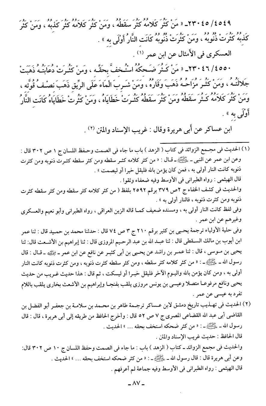 4549/ 23045 - "مَنْ كَثُرَ كَلامُهُ كَثُرَ سَقَطُهُ، وَمَنْ كَثُرَ كَلامُهُ كَثُرَ كَذِبُهُ، وَمَنْ كَثُرَ كَذِبُهُ كَثُرَتْ ذنُوبُهُ، وَمَنْ كَثُرَتْ ذُنُوُبهُ كَانَتِ النَّارُ أَوْلَى بِهِ".