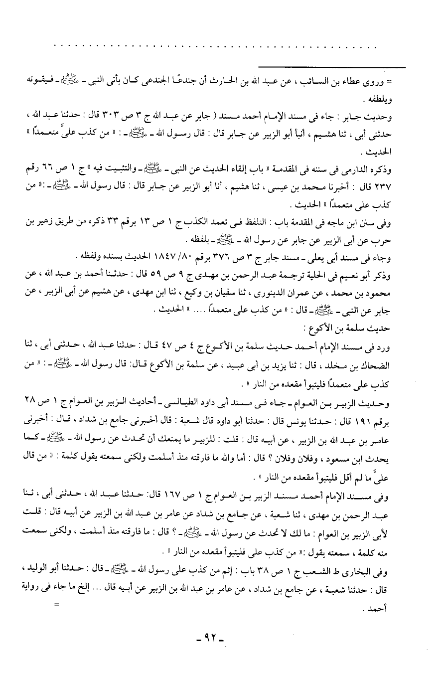 وحديث جابر: جاء في مسند الإمام أحمد مسند (جابر عن عبد الله ج 3 ص 303 قال: حدثنا عبد الله، حدثني أبي، ثنا هشيم، أنبأ أبو الزبير عن جابر قال: قال رسول الله - صلى الله عليه وسلم -: "من كذب عليَّ متعمدًا" الحديث.