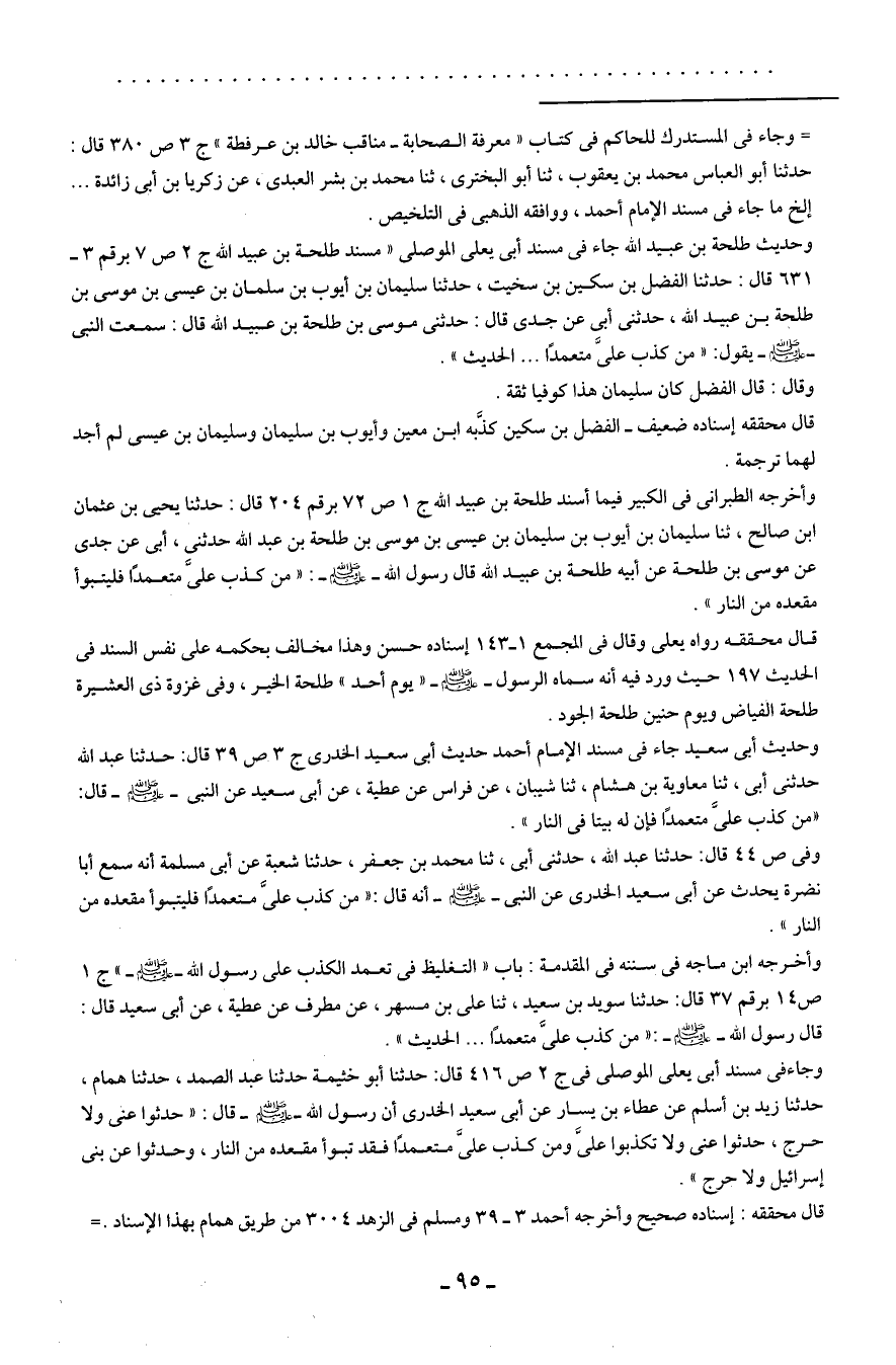 وحديث طلحة بن عبد الله جاء في مسند أبي يعلى الموصلى "مسند طلحة بن عيد الله ج 2 ص 7 برقم 3 - 631 قال: حدثنا الفضل بن سكين بن سخيت، حدثنا سليمان بن أيوب بن سلمان بن عيسى بن موسى بن طلحة بن عبيد الله، حدثني أبي عن جدى قال: حدثني موسى بن طلحة بن عبيد الله قال: سمت النبي - صلى الله عليه وسلم - يقول: "من كذب عليَّ متعمدًا ... الحديث".