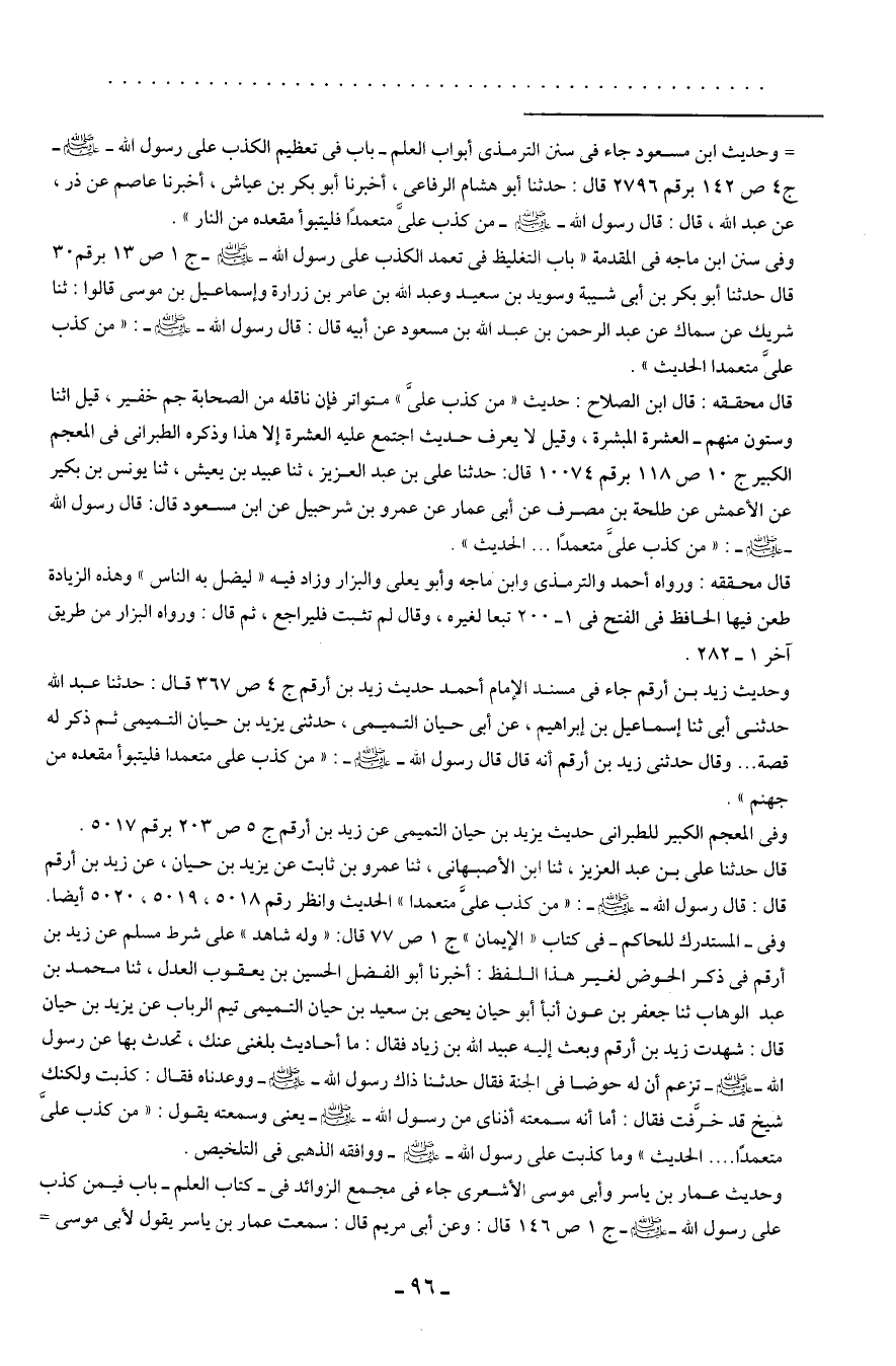 قال محققه: قال ابن الصلاح: حديث "من كذب عليَّ" متواتر فإن ناقله هن الصحابة جم خفير، قيل اثنا وستون منهم- العشرة المبشرة، وقيل لا يعرف حديث اجتمع عليه العشرة إلا هذا وذكره الطبراني في المعجم الكبيرج 10 ص 118 برقم 10074 قال: حدثنا علي بن عبد العزيز، ثنا عبيد بن يعيش، ثنا يونس بن بكير عن الأعمش عن طلحة بن مصرف عن أبي عمار عن عمرو بن شرحبيل عن ابن مسعود قال: قال رسول الله - صلى الله عليه وسلم -: "من كذب علي متعمدًا ... الحديث".