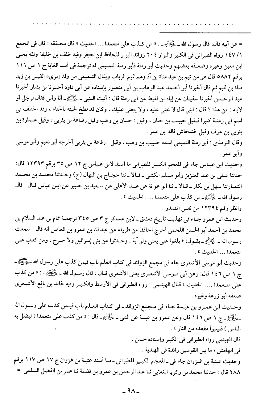 وحديث ابن عمرو بن عبسة جاء في مجمع الزوائد- في كتاب العلم باب فيمن كذب على رسول الله - صلى الله عليه وسلم - ج 1 ص 146 قال وعن عمرو بن عبسة عن النبي - صلى الله عليه وسلم - قال: "من كذب على متعمدا (ليضل به الناس) فليتبوأ مقعده من النار".