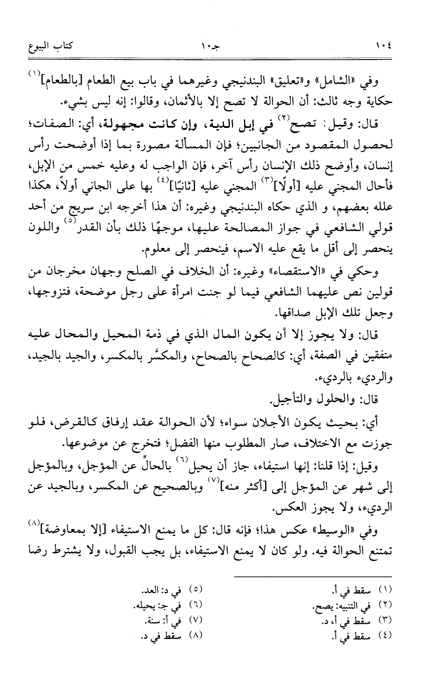 قال: وقيل: تصح في إبل الدية، وإن كانت مجهولة، أي: الصفات؛ لحصول المقصود من الجانبين؛ فإن المسألة مصورة بما إذا أوضحت رأس إنسان، وأوضح ذلك الإنسان رأس آخر، فإن الواجب له وعليه خمس من الإبل، فأحال المجني عليه [أولاً] المجني عليه [ثانياً] بها على الجاني أولاً، هكذا علله بعضهم، والذي حكاه البندنيجي وغيره: أن هذا أخرجه ابن سريج من أحد قولي الشافعي في جواز المصالحة عليها، موجهاً ذلك بأن القدر واللون ينحصر إلى أقل ما يقع عليه الاسم، فينحصر إلى معلوم.