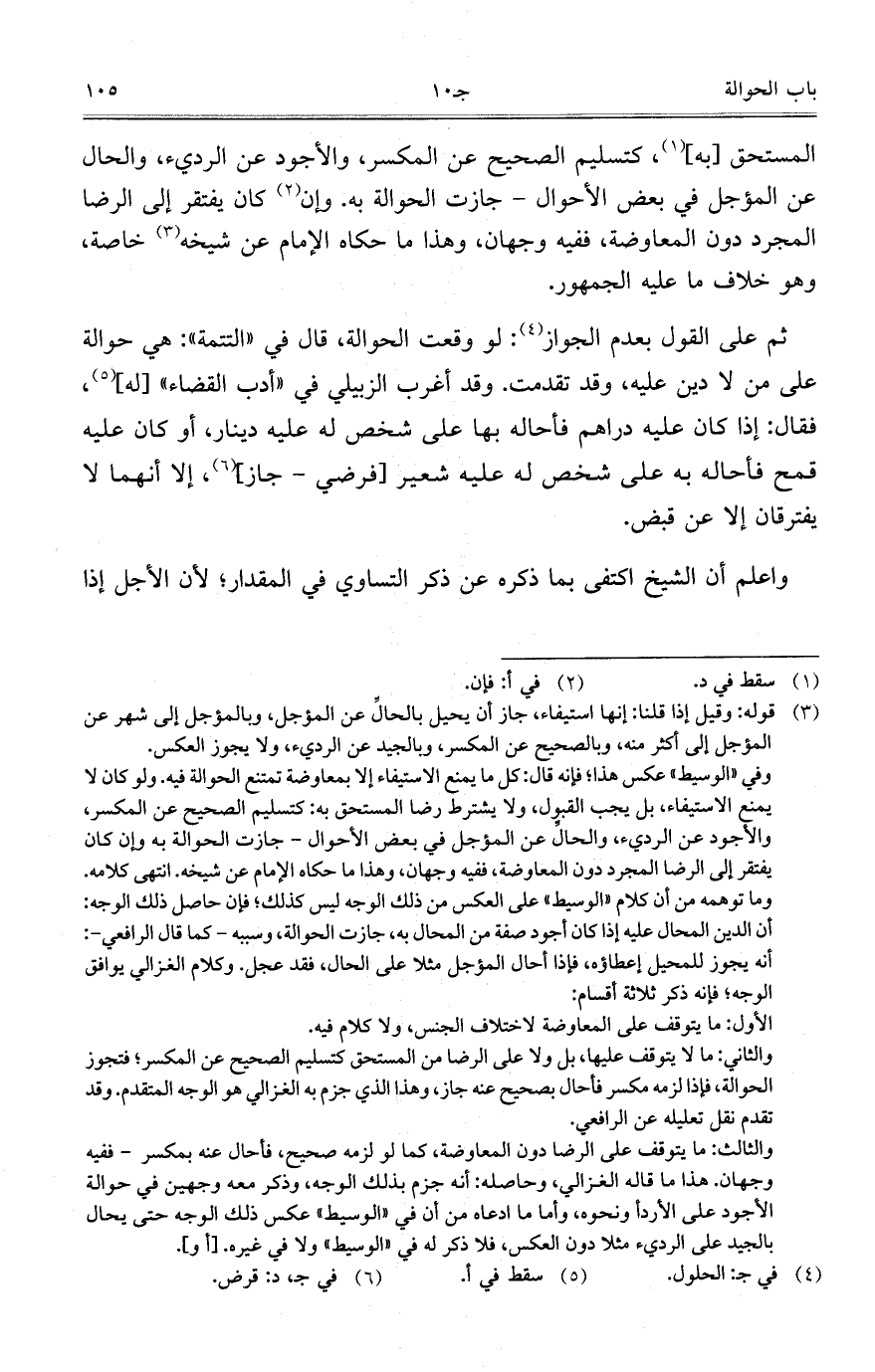 المستحق [به]، كتسليم الصحيح عن المكسر، والأجود عن الرديء، والحال عن المؤجل في بعض الأحوال – جازت الحوالة به. وإن كان يفتقر إلى الرضا المجرد دون المعاوضة، ففيه وجهان، وهذا ما حكاه الإمام عن شيخه خاصة، وهو خلاف ما عليه الجمهور.