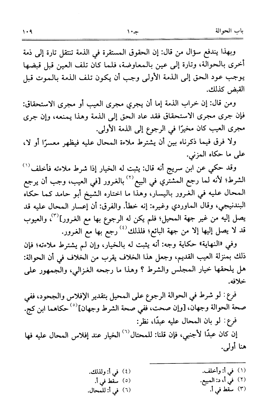 وقد حكى عن ابن سريج أنه قال: يثبت له الخيار إذا شرط ملاءته فأخلف الشرط؛ لأنه لما رجع المشتري في البيع بالغرور [في العيب، وجب أن يرجع المحال عليه في الغرور باليسار، وهذا ما اختاره الشيخ أبو حامد كما حكاه البندنيجي، وقال الماوردي وغيره: إنه خطأ. والفرق: أن إعسار المحال عليه قد يصل إليه من غير جهة المحيل؛ فلم يكن له الرجوع بها مع الغرور]، والعيوب قد لا يصل إليها إلا من جهة البائع؛ فلذلك رجع بها مع الغرور.