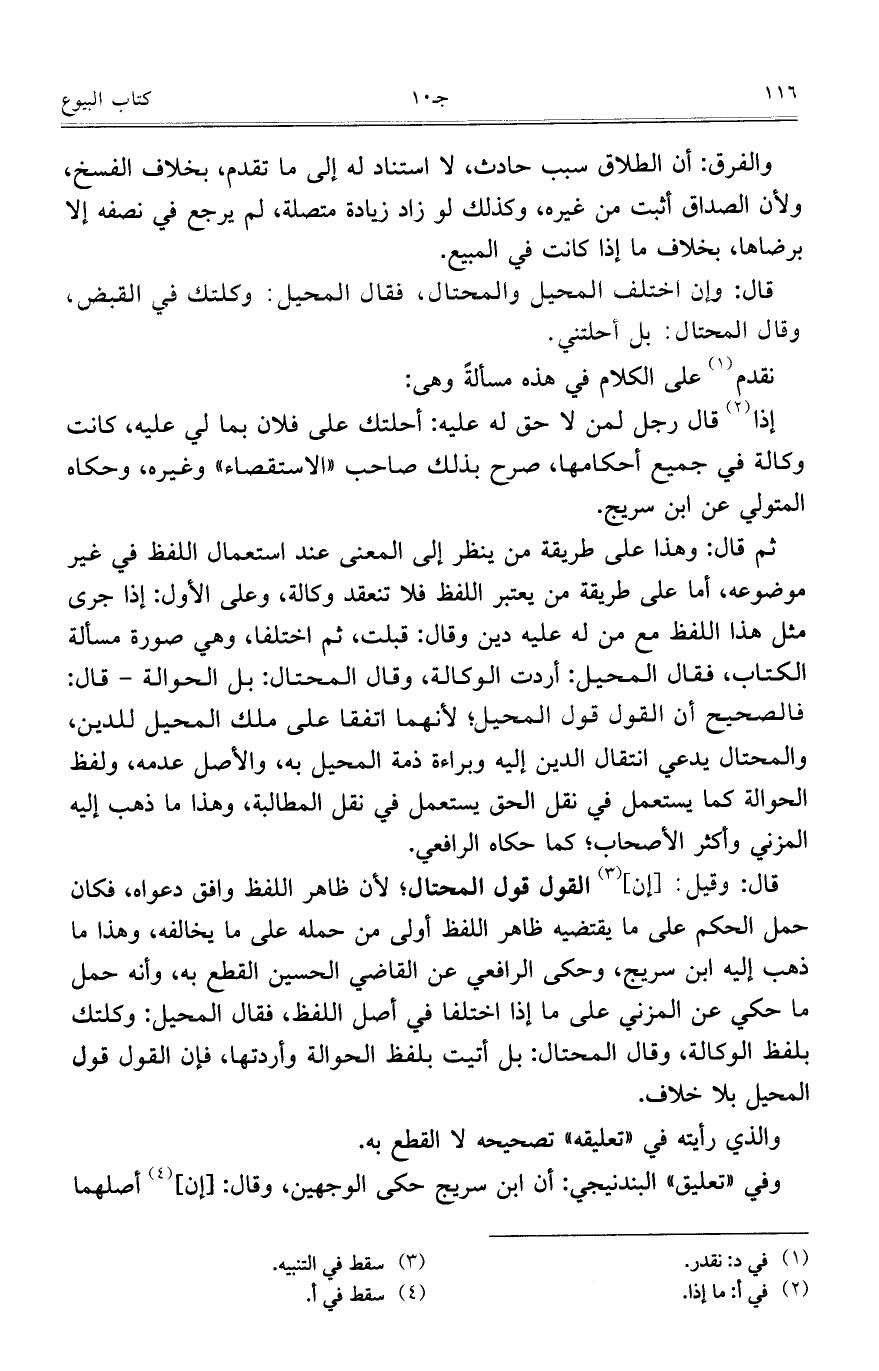 قال: وقيل: [إن] القول قول المحتال؛ لأن ظاهر اللفظ وافق دعواه، فكان حمل الحكم على ما يقتضيه ظاهر اللفظ أولى من حمله على ما يخالفه، وهذا ما ذهب إليه ابن سريج، وحكى الرافعي عن القاضي الحسين القطع به، وأنه حمل ما حكى عن المزني على ما إذا اختلفا في أصل اللفظ، فقال المحيل: وكلتك بلفظ الوكالة، وقال المحتال: بل أتيت بلفظ الحوالة واردتها، فإن القول قول المحيل بلا خلاف.