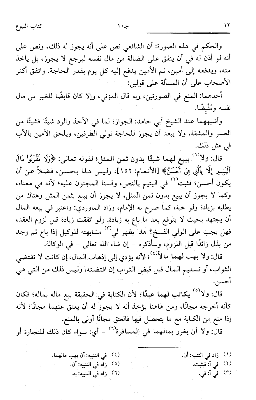 قال: ولا يبيع لهما شيئاً بدون ثمن المثل؛ لقوله تعالى: {وَلا تَقْرَبُوا مَالَ الْيَتِيمِ إِلاَّ بِالَّتِي هِيَ أَحْسَنُ} [الأنعام: 152]، وليس هذا بحسن؛ فثبت في اليتيم بالنص، وقسنا المجنون عليه؛ لأنه في معناه، وكما لا يجوز أن يبيع بدون ثمن المثل، لا يجوز أن يبيع بثمن المثل وهناك من يطلبه بزيادة ولو حبة، كما صرح به الإمام، وزاد الماوردي: واعتبر في بيعه المال أن يجتهد بحيث لا يتوقع بعد ما باع به زيادة. ولو اتفقت زيادة قبل لزوم العقد، فهل يجب على الولي الفسخ؟ هذا يظهر لي مشابهته للوكيل إذا باع ثم وجد من بذل زائداً قبل اللزوم، وسأذكره – إن شاء الله تعالى – في الوكالة.