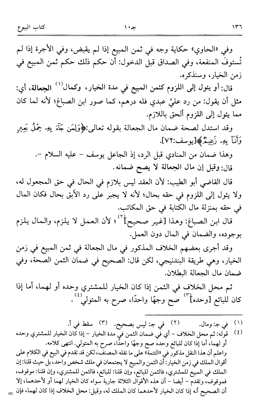 وقد أجرى بعضهم الخلاف المذكور في مال الجعالة في ثمن المبيع في زمن الخيار، وهي طريقة البندنيجي، لكن قال: الصحيح في ضمان الثمن الصحة، وفي ضمان مال الجعالة البطلان.