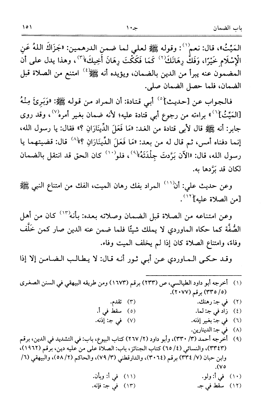 فالجواب عن [حديث] أبي قتادة: أن المراد من قوله صلى الله عليه وسلم: "وَبَرِئَ مِنْهُ [المَيِّتُ] " براءته من رجوع أبي قتادة عليه؛ لأنه ضمان بغير أمره، وقد روى جابر: أنه صلى الله عليه وسلم قال لأبي قتادة من الغد: "مَا فَعَل الدِّينَارَانِ؟ " فقال: يارسول الله، إنما دفناه أمس، ثم قال له من بعد: "مَا فَعَل الدِّينَارَانِ؟ " قال: قضيتهما يا رسول الله، قال: "الآن بَرَّدتَ جِلْدَتَه"، فلو كان الحق قد انتقل بالضمان لكان قد بَرَّدها به.