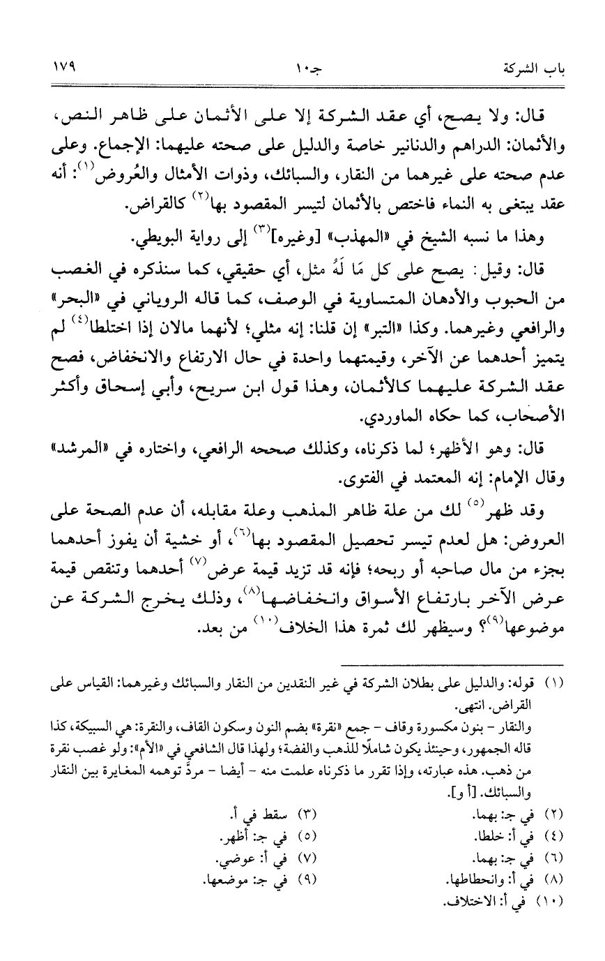 قال: ولا يصح، أي عقد الشركة إلا على الأثمان على ظاهر النص، والأثمان: الدراهم والدنانير خاصة والدليل على صحته عليهما: الإجماع. وعلى عدم صحته على غيرهما من النقار، والسبائك، وذوات الأمثال والعُروض: أنه عقد يبتغي به النماء فاختص بالأثمان لتيسر المقصود بها كالقراض.