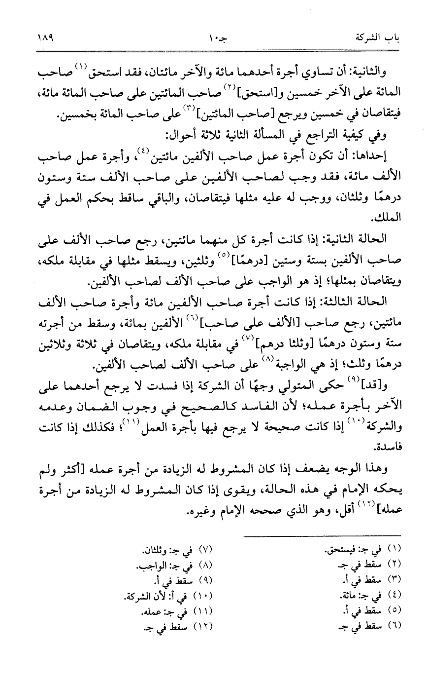 إحداها: أن تكون أجرة عمل صاحب الألفين مائتين، وأجرة عمل صاحب الألف مائة، فقد وجب لصاحب الألفين على صاحب الألف ستة وستون درهماً وثلثان، ووجب له عليه مثلها فيتقاصان، والباقي ساقط بحكم العمل في الملك.