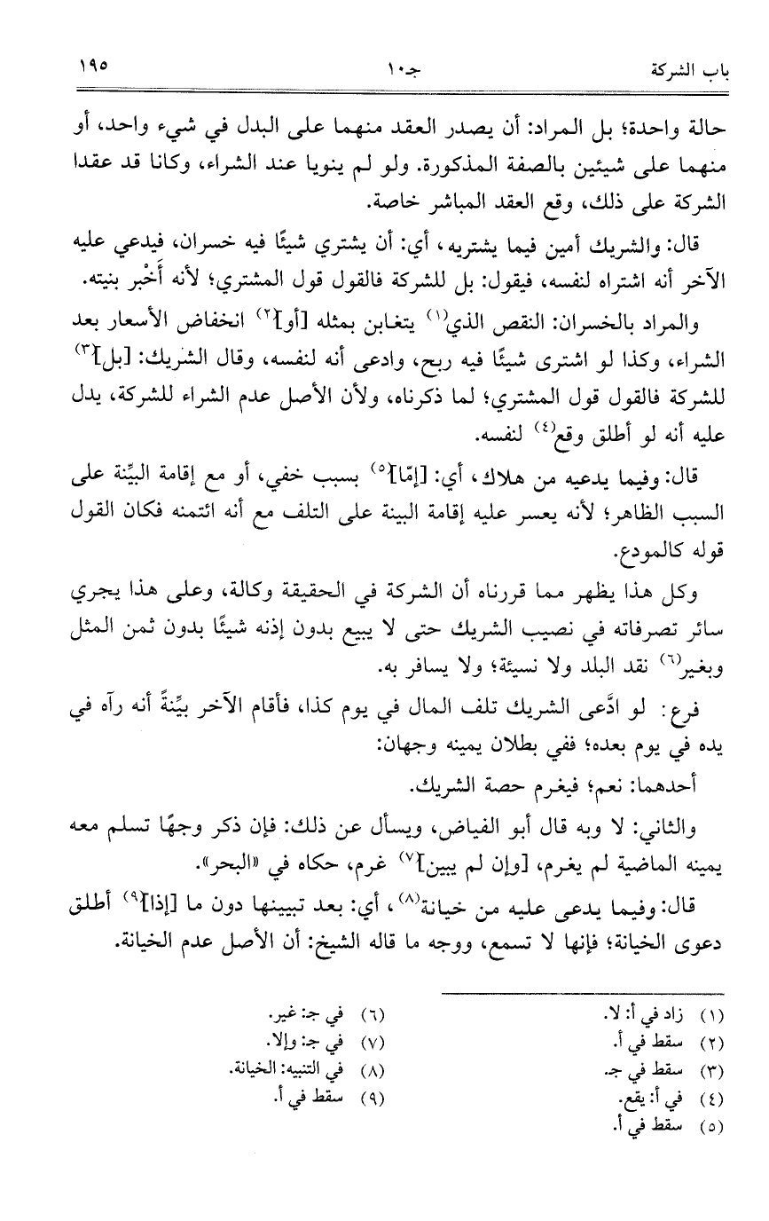 وكل هذا يظهر مما قررناه أن الشركة في الحقيقة وكالة، وعلى هذا يجري سائر تصرفاته في نصيب الشريك حتى لا يبيع بدون إذنه شيئاً بدون ثمن المثل وبغير نقد البلد ولا نسيئة؛ ولا يسافر به.