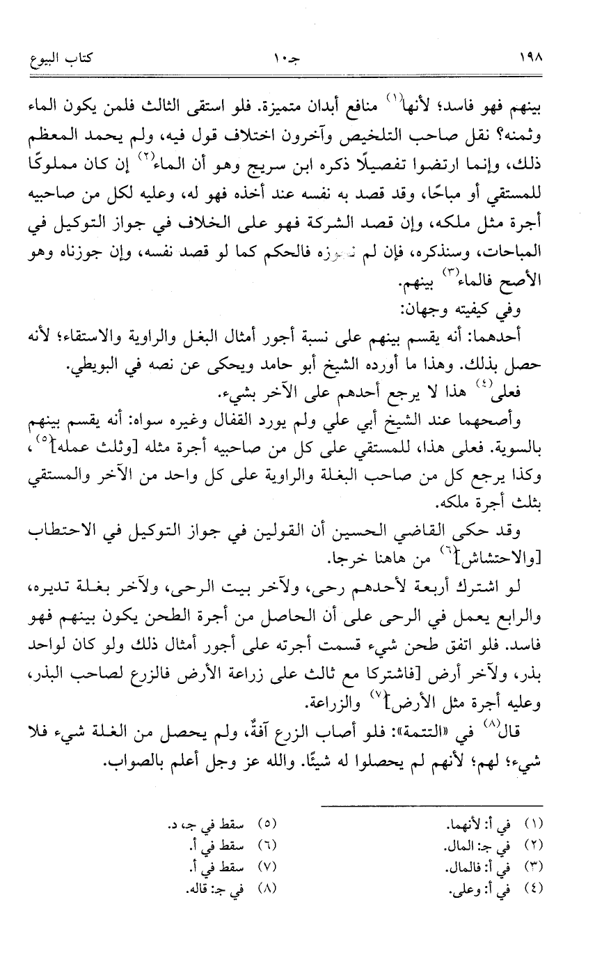 بينهم فهو فاسد؛ لأنها منافع أبدان متميزة. فلو استقى الثالث فلمن يكون الماء وثمنه؟ نقل صاحب التلخيص وآخرون اختلاف قول فيه، ولم يحمد المعظم ذلك، وإنما ارتضوا تفصيلاً ذكره ابن سريج وهو أن الماء إن كان مملوكاً للمستقي أو مباحاً، وقد قصد به نفسه عند أخذه فهو له، وعليه لكل من صاحبيه أجرة مثل ملكه، وإن قصد الشركة فهو على الخلاف في جواز التوكيل في المباحات، وسنذكره، فإن لم نجوزه فالحكم كما لو قصد نفسه، وإن جوزناه وهو الأصح فالماء بينهم.