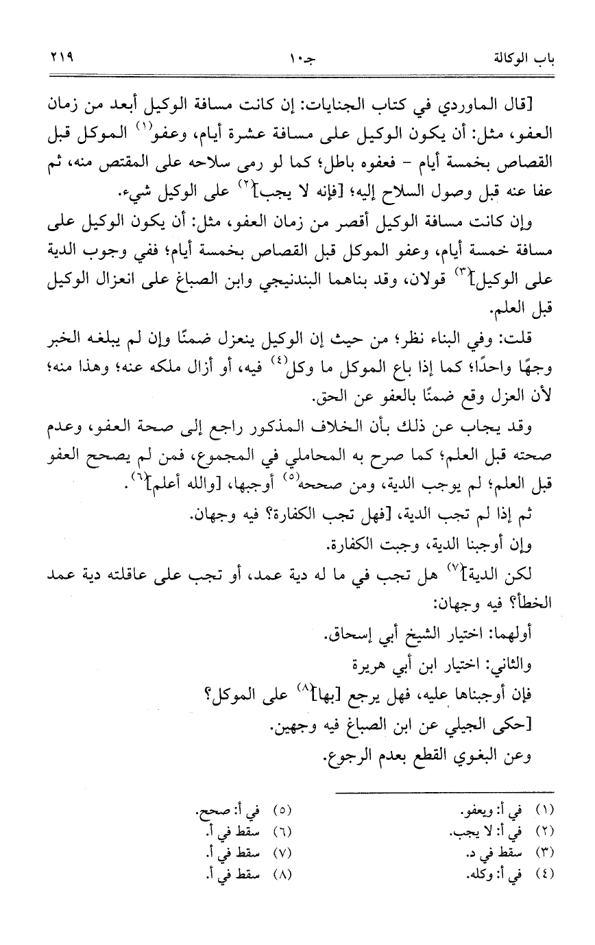 [قال الماوردي في كتاب الجنايات: إن كانت مسافة الوكيل أبعد من زمان العفو، مثل: أن يكون الوكيل على مسافة عشرة أيام، وعفو الموكل قبل القصاص بخمسة أيام – فعفوه باطل؛ كما لو رمى سلاحه على المقتص منه، ثم عفا عنه قبل وصول السلاح إليه؛ [فإنه لا يجب] على الوكيل شيء.