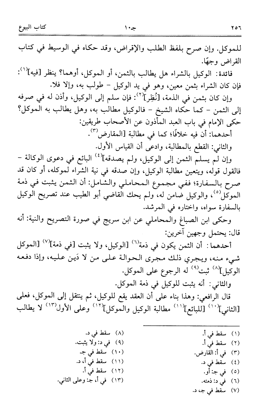وإن لم يسلم الثمن إلى الوكيل، ولم يصدقه] البائع في دعوى الوكالة – فالقول قوله، ويتعين مطالبة الوكيل، وإن صدقه في نية الشراء لموكله، أو كان قد صرح بالسفارة؛ ففي مجموع المحاملي والشامل: أن الثمن يثبت في ذمة الموكل، والوكيل ضامن له، ولم يحك لقاضي أبو الطيب عند تصريح الوكيل بالسفارة سواه، واختاره في المرشد.