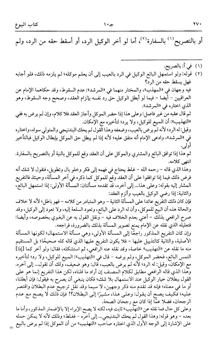 أو بالتصريح بالسفارة، أما لو أخر الوكيل الرد، أو أسقط حقه من الرد، ولم