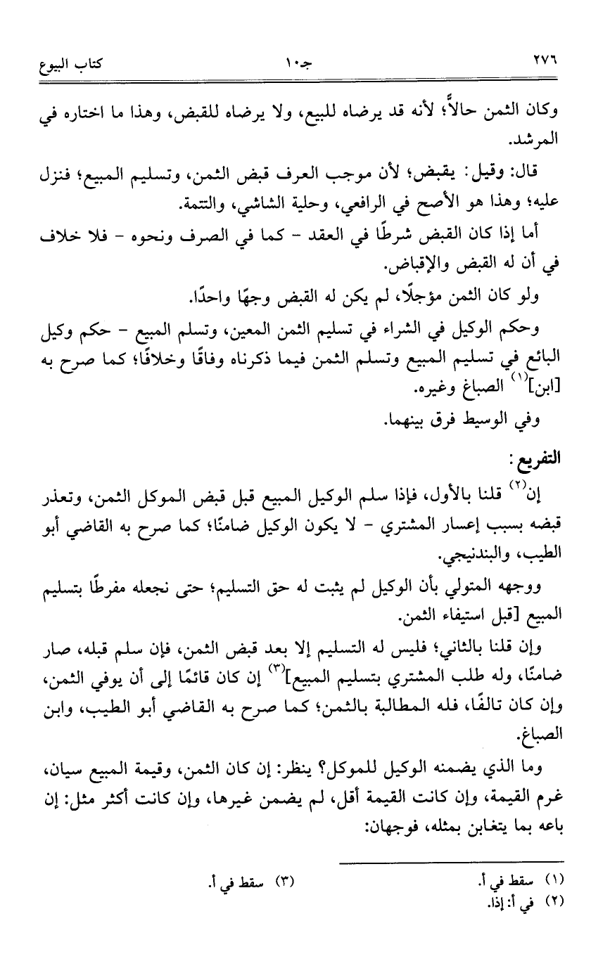 وحكم الوكيل في الشراء في تسليم الثمن المعينن وتسلم المبيع – حكم وكيل البائع في تسليم المبيع وتسلم الثمن فيما ذكرناه وفاقاً وخلافاً؛ كما صرح به [ابن] الصباغ وغيره.