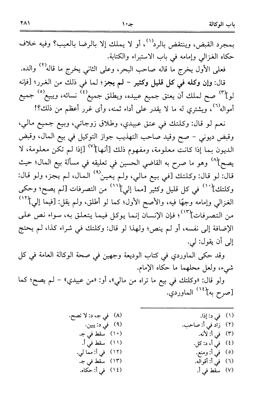 نعم لو قال: وكلتك في عتق عبيدي، وطلاق زوجاتي، وبيع جميع مالي، وقبض ديوني – صح وقيد صاحب التهذيب جواز التوكيل في بيع المال، وبض الديون بما إذا كانت معلومة، ومفهوم ذلك [أنها] [إذا لم تكن معلومة، لا يصح] وهو ما صرح به القاضي الحسين في تعليقه في مسألة بيع المال؛ حيث قال: لو قال: وكلتك [في بيع مالي، ولم يعين المال، لم يجز، ولو قال: وكلتك] في كل قليل وكثير [مما إلي] من التصرفات [لم يصح؛ وحكى الغزالي وإمامه وجهاً فيه، والأصح الأول؛ كما لو أطلق، ولم يقل: [فيما إلي] من التصرفات]؛ فإن الإنسان إنما يوكل فيما يتعلق به، سواء نص على الإضافة إلى نفسه، أو لم ينص؛ ولهذا لو قال: وكلتك في شراء كذا، لم يحتج إلى أن يقول: لي.