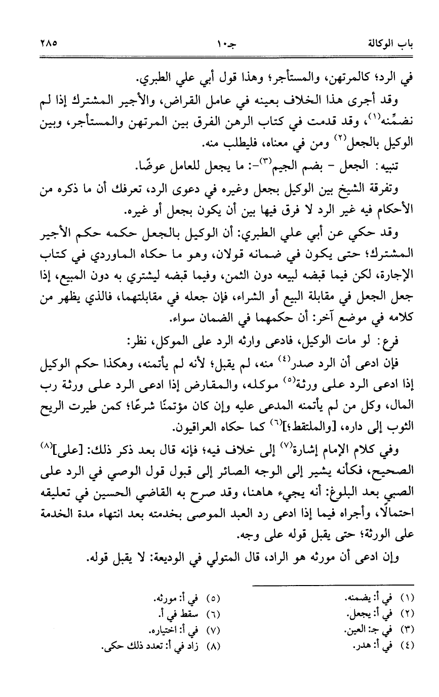 وتفرقة الشيخ بين الوكيل بجعل وغيره في دعوى الرد، تعرفك أن ما ذكره من الأحكام فيه غير الرد لا فرق فيها بين أن يكون بجعل أو غيره.