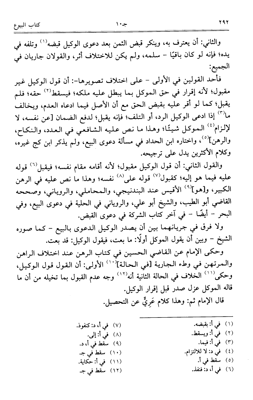 والثاني: أن يعترف به، وينكر قبض الثمن بعد دعوى الوكيلقبضه وتلفه في يده؛ فإنه لو كان باياً – سلمه، ولم يكن للاختلاف أثر، والقولان جاريان في الجميع: