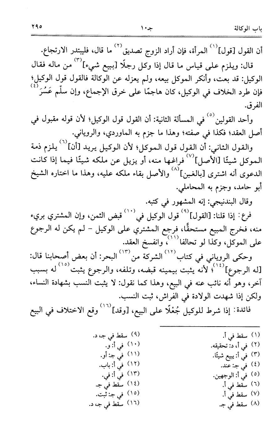 والقول الثاني: أن القول قول الموكل؛ لأن الوكيل يريد [أن] يلزم ذمة الموكل شيئاً [الأصل] فراغها منه، أو يزيل عن ملكه شيئاً فيما إذا كانت الدعوى أنه اشترى [بالغين] والأصل بقاء ملكه عليه، وهذا ما اختاره الشيخ أبو حامد، وجزم به المحاملي.