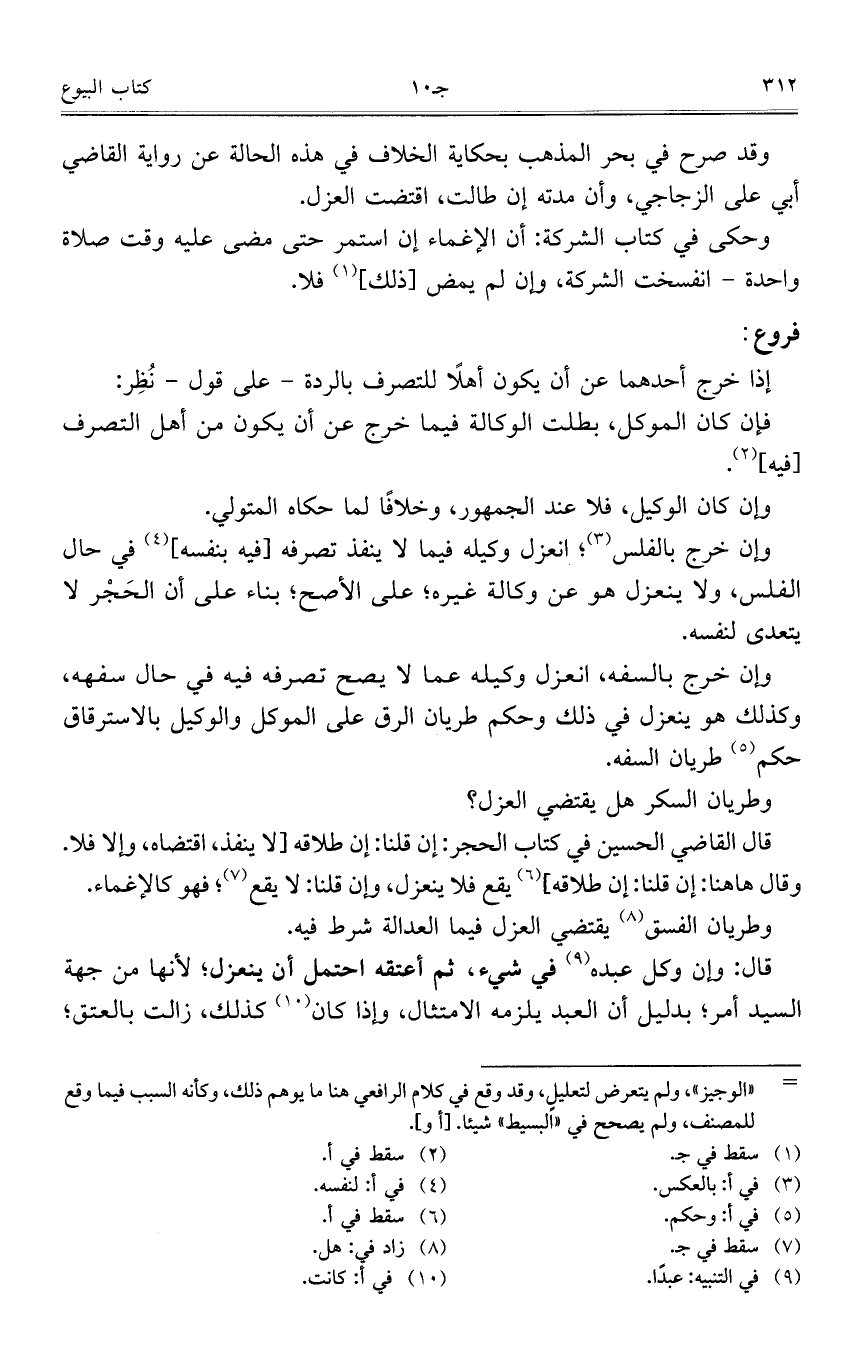 وإن خرج بالسفه، انعزل وكيله عما لا يصح تصرفه فيه في حال سفهه، وكذلك هو ينعزل في ذلك وحكم طريان الرق على الموكل والوكيل بالاسترقاق حكم طريان السفه.