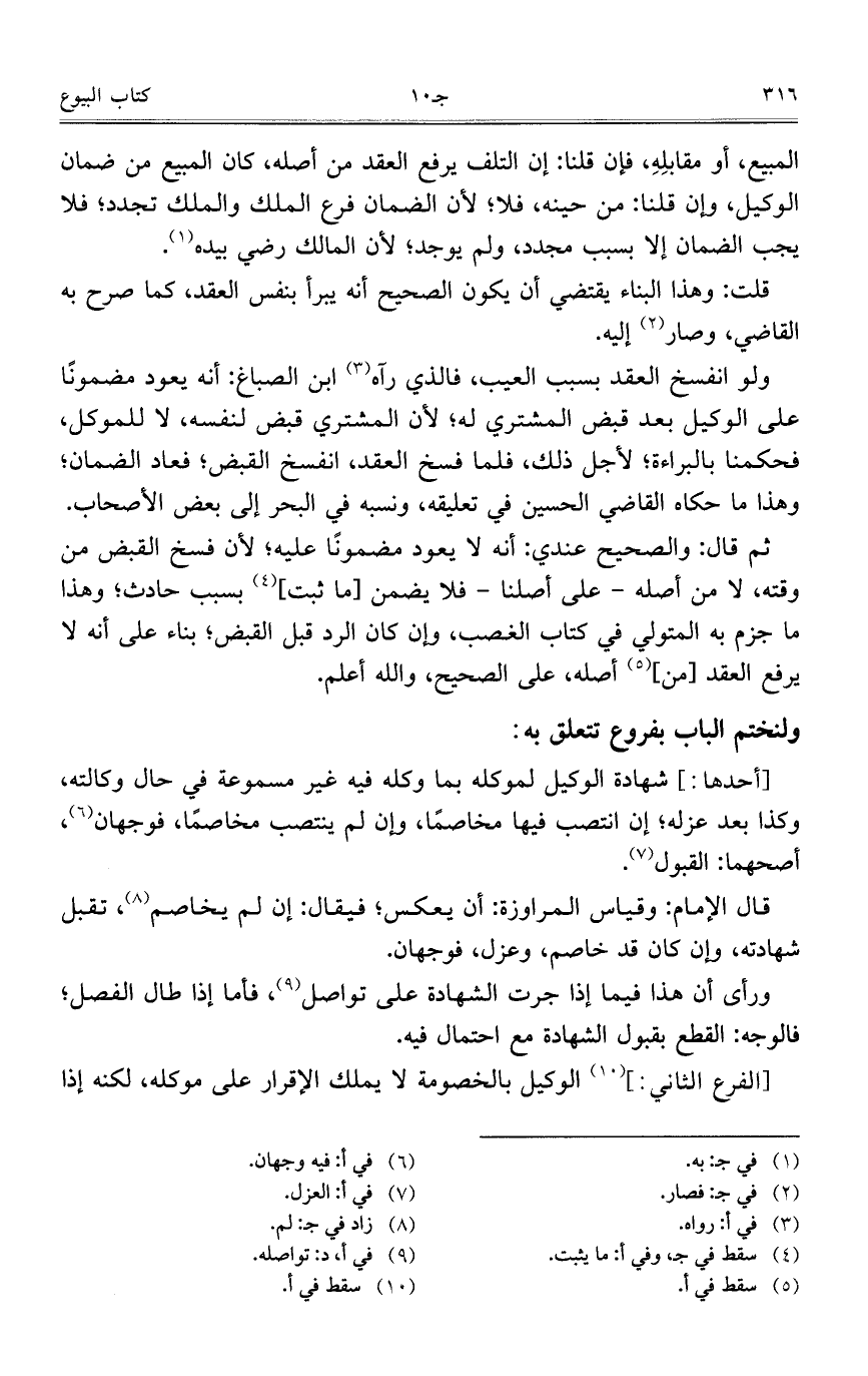 ولو انفسخ العقد بسبب العيب، فالذي رآه ابن الصباغ: أنه يعود مضموناً على الوكيل بعد قبض المشتري له؛ لأن المشتري قبض لنفسه، لا للموكل، فحكما بالبراءة؛ لأجل ذلك، فلما فسخ العقد، انفسخ القبض؛ فعاد الضمان؛ وهذا ما حكاه القاضي الحسين في تعليقه، ونسبه في البحر إلى بعض الأصحاب.