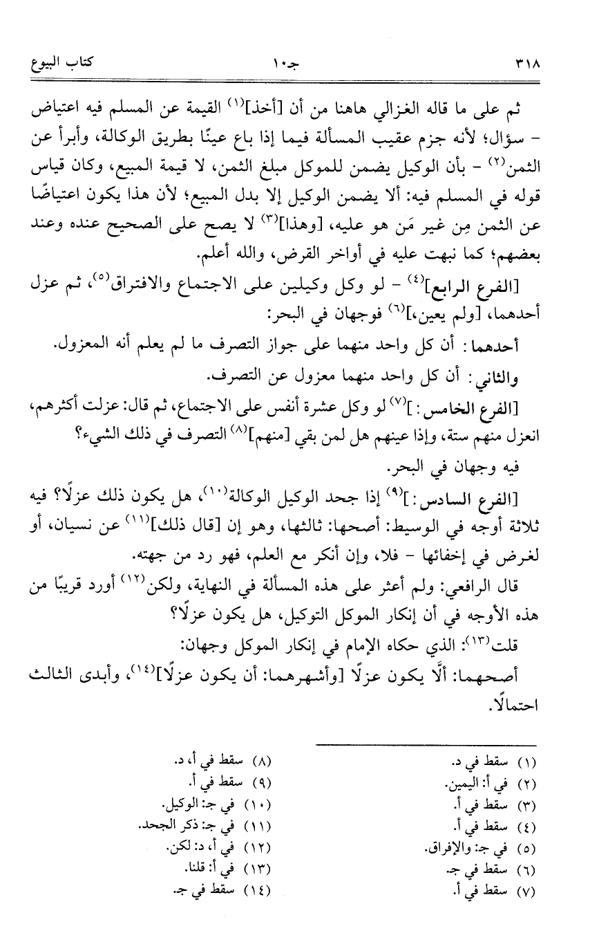 [الفرع السادس:] إذا جحد الوكيل الوكالة، هل يكون ذلك عزلاً؟ فيه ثلاثة أوجه في الوسيط: أصحها: ثالثها، وهو إن [قال ذلك] عن نسيان، أو لغرض في إخفائها – فلا، وإن أنكر مع العلم، فهو رد من جهته.
