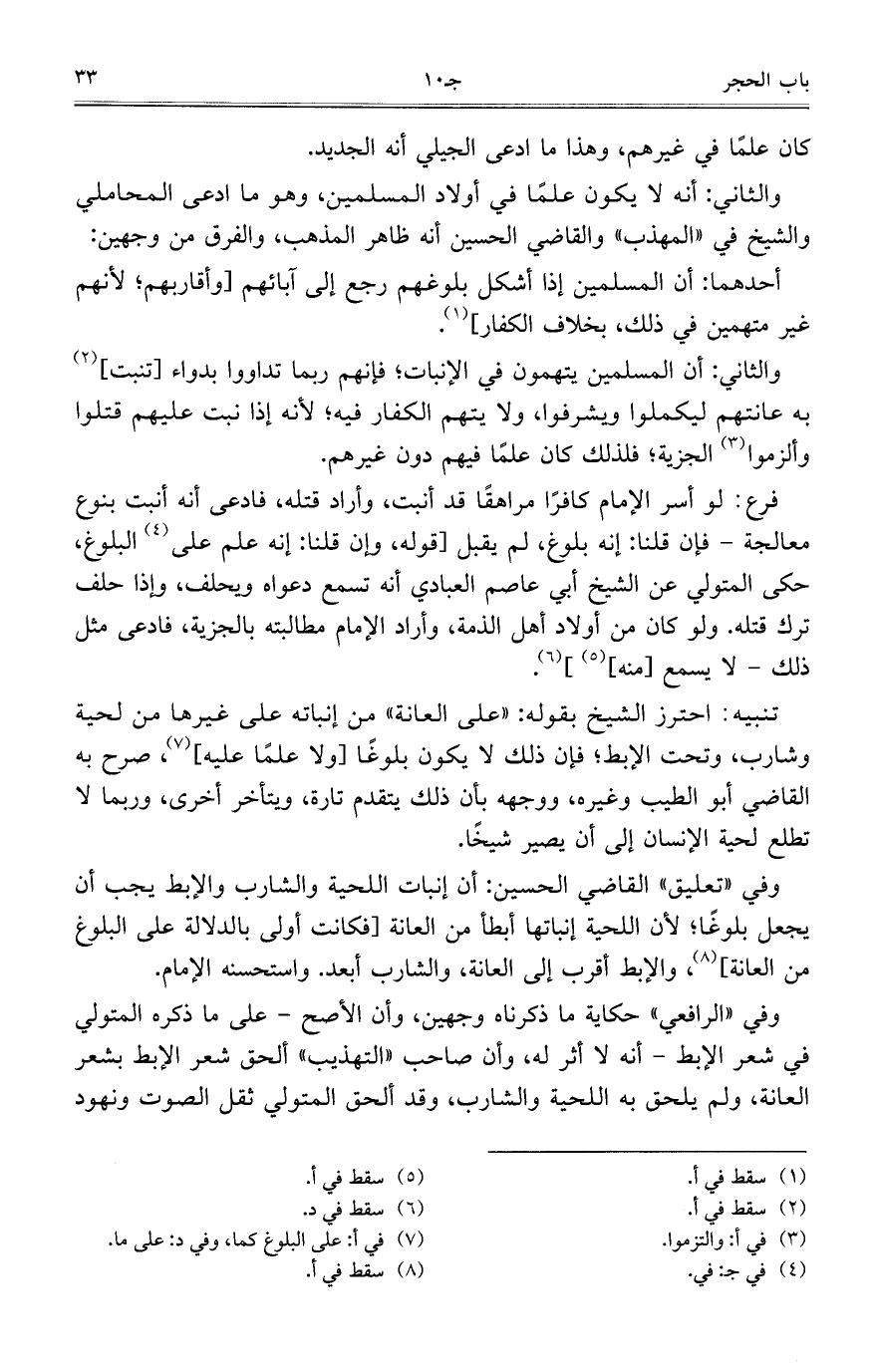 رع: لو أسر الإمام كافراً مراهقاً قد أنبت، وأراد قتله، فادعى أنه أنبت بنوع معالجة – فإن قلنا – إنه بلوغ، لم يقبل [قوله، وإن قلنا: إنه علم على البلوغ، حكى المتولي عن الشيخ أبي عاصم العبادي أنه تسمع دعواه ويحلف، وإذا حلف ترك قتله. ولو كان من أولاد أهل الذمة، وأراد الإمام مطالبته بالجزية، فادعى مثل ذلك – لا يسمع [منه]].