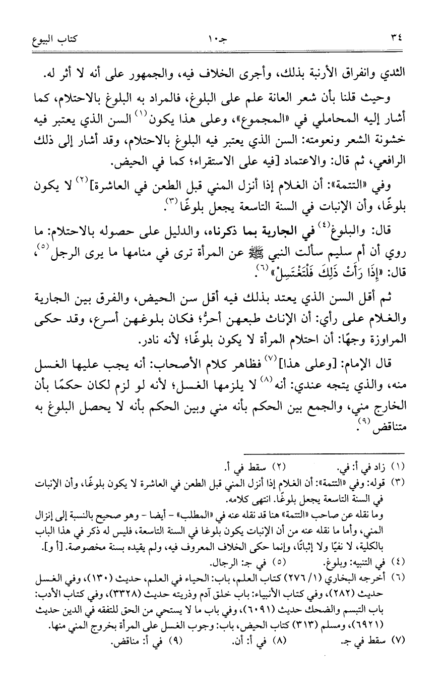 قال: والبلوغ في الجارية بما ذكرناه، والدليل على حصوله بالاحتلام: ما روي أن أم سليم سألت النبي صلى الله عليه وسلم عن المرأة ترى في منامها ما يرى الرجل، قال: "إِذَا رَأَتْ ذَلِكَ فَلْتَغْتَسِلْ".