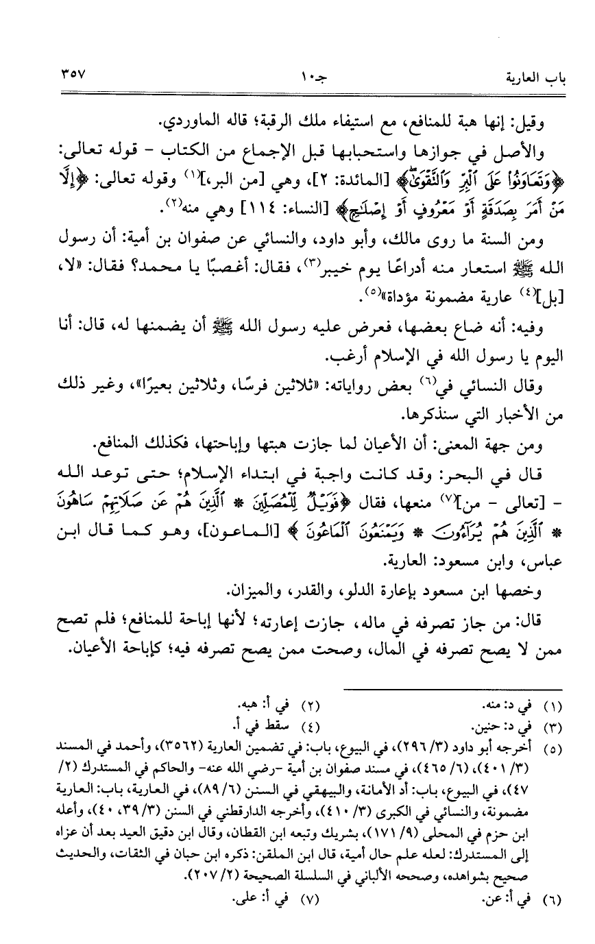 ومن السنة ما روى مالك، وأبو داود، والنسائي عن صفوان بن أمية: أن رسول الله صلى الله عليه وسلم استعار منه أدراعاً يوم خيبر، فقال: أغصباً يا محمد؟ فقال: "لا، [بل] عارية مضمونة مؤداة".