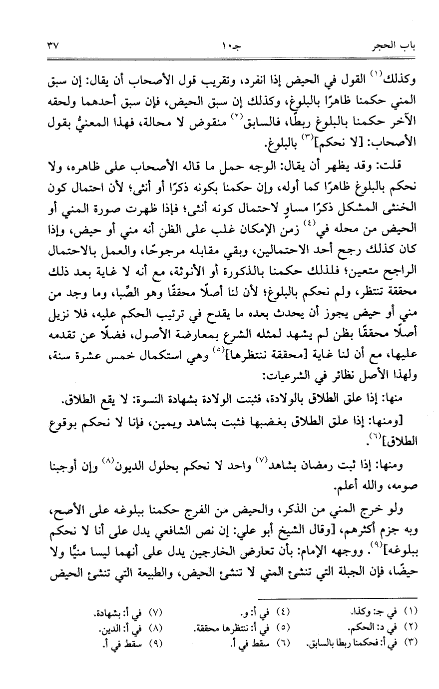 قلت: وقد يظهر أن يقال: الوجه حمل ما قاله الأصحاب على ظاهره، ولا نحكم بالبلوغ ظاهراً كما أوله، وإن حكمنا بكونه ذكرا ًأو أنثى؛ لأن احتمال كون الخنثى المشكل ذكراً مساوٍ لاحتمال كونه أنثى؛ فإذا ظهرت صورة المني أو الحيض من محله في زمن الإمكان غلب على الظن أنه مني أو حيض، وإذا كان كذلك رجح أحد الاحتمالين، وبقي مقابله مرجوحاً، والعمل بالاحتمال الراجح متعين؛ فلذلك حكما بالذكورة أو الأنوثة، مع أنه لا غاية بعد ذلك محققة تنتظر، ولم نحكم بالبلوغ؛ لأن لنا أصلاً محققاً وهو الصِّبان وما وجد من مني أو حيض يجوز أن يحدث بعده ما يقدح في ترتيب الحكم عليه، فلا نزيل أصلاً محققاً بظن لم يشهد لمثله الشرع بمعارضة الأصول، فضلاً عن تقدمه عليها، مع أن لنا غاية [محققة ننتظرها] وهي استكمال خمس عشرة سنة، ولهذا الأصل نظائر في الشرعيات: