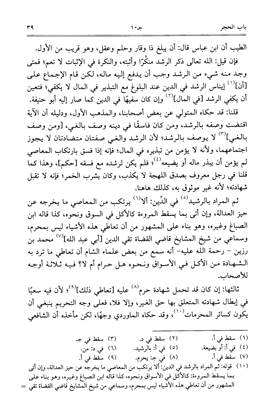 ثم المراد بالرشيد في الدِّين: ألا يرتكب من المعاصي ما يخرجه عن حيز العدالة، وإن أتى بما يسقط المروءة كالأكل في السوق ونحوه، كذا قاله ابن الصباغ وغيره، وهو بناء على المشهور من أن تعاطي هذه الأشياء ليس بمحرم، وسماعي من شيخ المشايخ قاضي القضاة تقي الدين [أبي عبد الله] محمد بن رزين – رحمة الله عليه – أنه سمع من بعض علماء الشام أن تعاطي ما ترد به الشهادة من الأكل في الأسواق ونحوه هل حرام أم لا؟ فيه ثلاثة أوجه للأصحاب.
