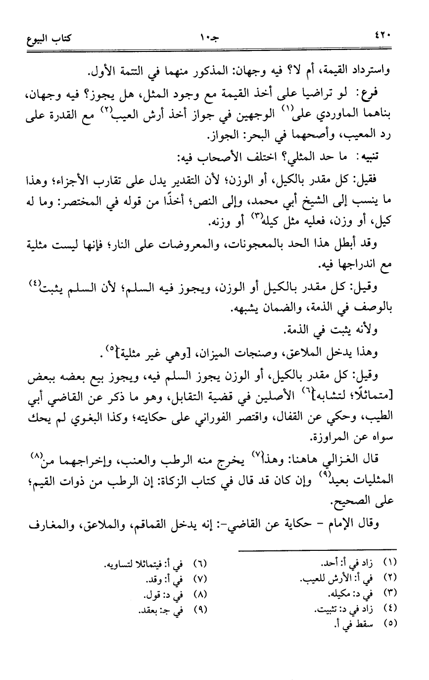 فقيل: كل مقدر بالكيل، أو الوزن؛ لأن التقدير يدل على تقارب الأجزاء؛ وهذا ما ينسب إلى الشيخ أبي محمد، وإلى النص؛ أخذاً من قوله في المختصر؛ وما له كيل، أو وزن، فعليه مثل كيله أو وزنه.