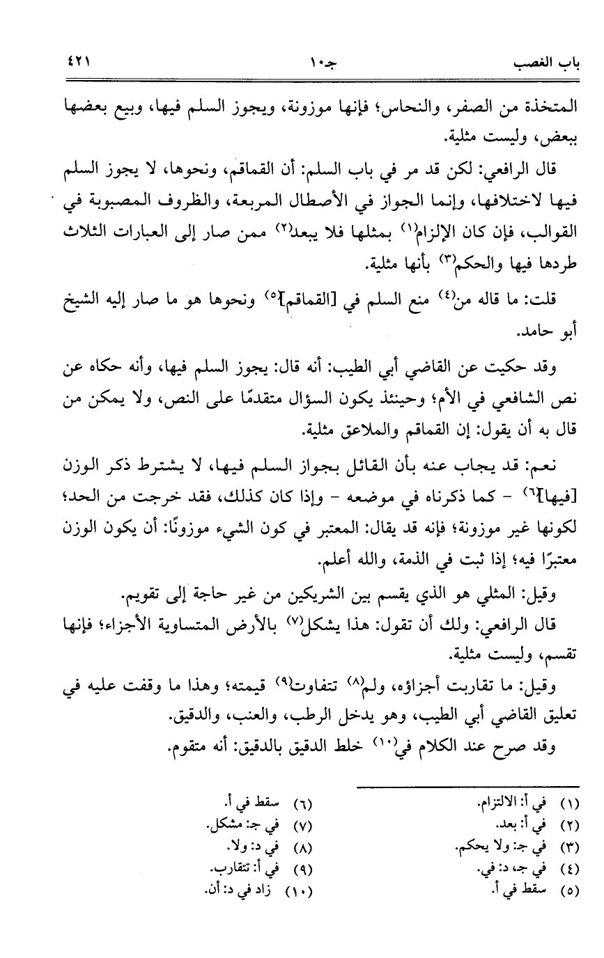 قال الرافعيك لكن قد مر في باب السلم: أن القماقم، ونحوها، لا يجوز السلم فيها لاختلافها، وإنما الجواز في الأصطال المربعة، والظروف المصبوبة في القوالب، فإن كان الإلزام بمثلها فلا يبعد ممن صار إلى العبارات الثلاث طردها فيها والحكم بأنها مثلية.