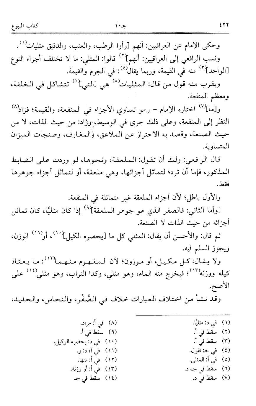 ونسب الرافعي إلى العراقيين: أنهم] قالوا: المثي: ما لا تختلف أجزاء النوع [الواحد] منه في القيمة، وربما يقال: في الجرم والقيمة.