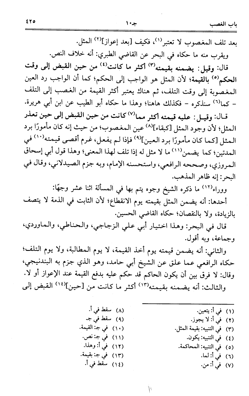 قال: وقيل: يضمنه بقيمته أكثر ما كانت من حين القبض إلى وقت الحكم بالقيمة؛ لأن المثل هو الواجب إلى الحكم؛ كما أن الواجب رد العين المغصوبة إلى وقت التلف، ثم هناك يعتبر أكثر القيمة من الغصب إلى التلف –كما ستذكره –فكذلك هاهنا؛ وهذا ما حكاه أبو الطيب عن ابن أبي هريرة.