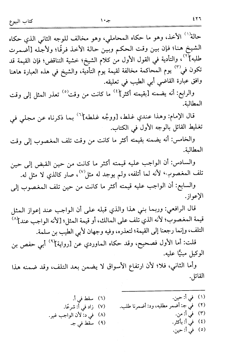 حالة الأخذ، وهو ما حكاه المحاملي، وهو مخالف للوجه الثاني الذي حكاه الشيخ هنا؛ فإن بين وقت الحكم وبين حالة الأخذ فرقاً؛ ولأجله [أضمرت طلبه]، والتأدية في القول الأول من كلام الشيخ؛ خشية التناقض؛ فإن القيمة قد تكون في يوم المحاكمة مخالفة لقيمة يوم التأدية، والشيخ في هذه العبارة هاهنا وافق عبارة القاضي أبي الطيب في تعليقه.