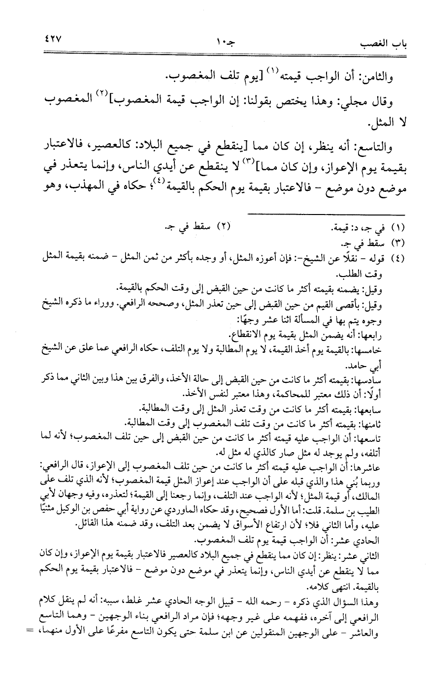 والتاسع: أنه ينظر، إن كان مما [ينقطع في جميع البلاد: كالعصير، فالاعتبار بقيمة يوم الإعواز، وإن كان مما] لا ينقطع عن أيدي الناس، وإنما يتعذر في موضع دون موضع – فالاعتبار بقيمة يوم الحكم بالقيمة؛ حكاه في المهذب، وهو