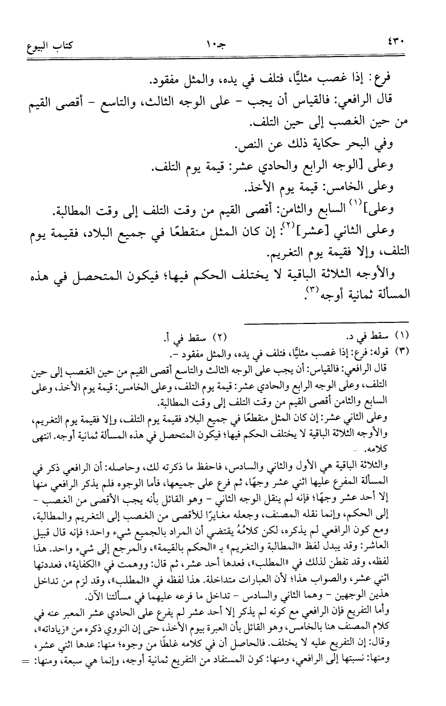 قال الرافعي: فالقياس أن يجب – على الوجه الثالث، والتاسع – أقصى القيم من حين الغصب إلى حين التلف.