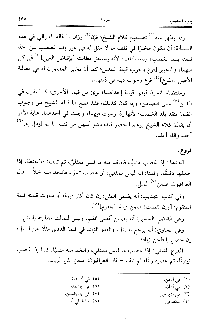 الفرع الثاني: إذا غصب ما ليس بمثلي، واتخذ منه مثليًّا: كما إذا غصب زيتوناً، ثم عصره زيتاً، ثم تلف – قال العراقيون: ضمن مثل الزيت.