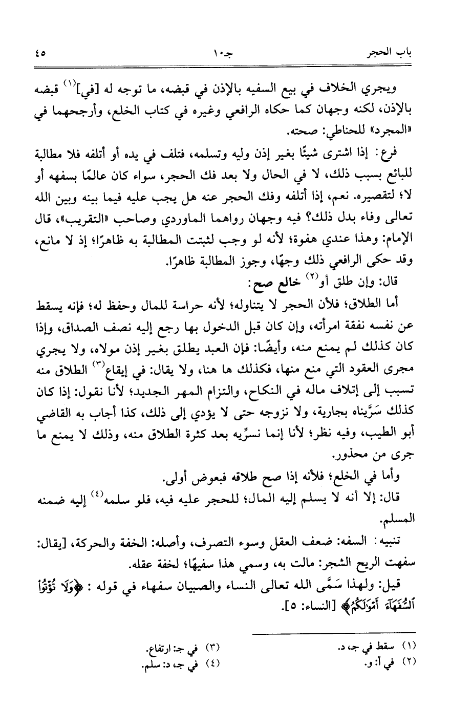 قيل: ولهذا سَمَّى الله تعالى النساء والصبيان سفهاء في قوله: {وَلا تُؤْتُوا السُّفَهَاءَ أَمْوَالَكُمْ} [النساء: 5].