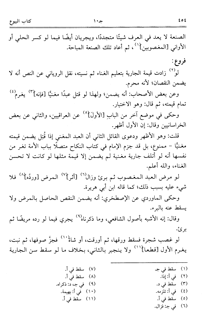 لو زادت قيمة الجارية بتعليم الغناء ثم نسيته، نقل الروياني عن النص أنه لا يضمن النقصان؛ لأنه محرم.